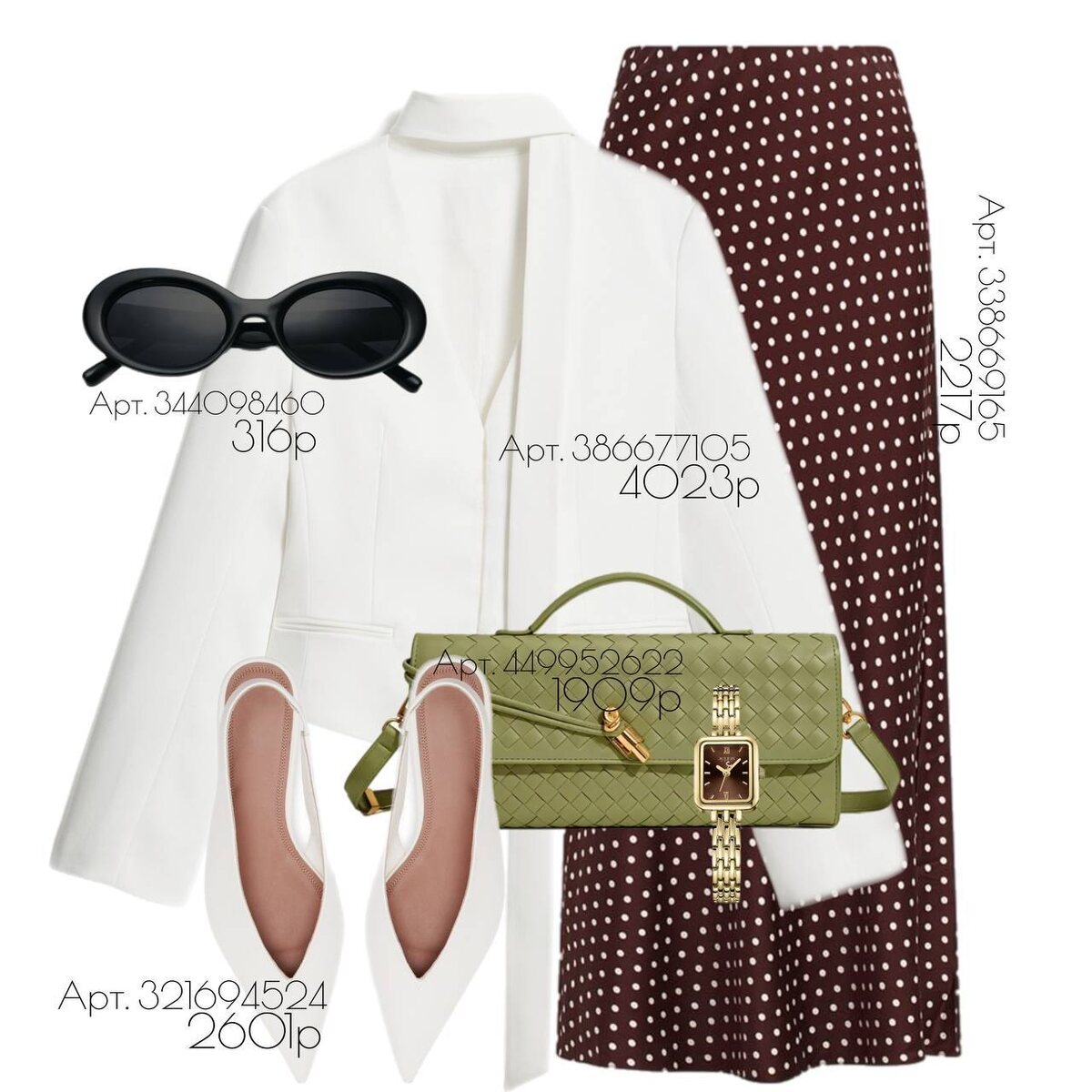 Этот образ сочетает в себе классическую элегантность и современные акценты. Белый жакет добавляет строгости и изысканности, а юбка в горох создает игривый и женственный силуэт. Такой наряд отлично подойдет для линейки и родительского собрания, позволяя вам выглядеть стильно и уверенно. Не забудьте про аксессуары: часы и очки подчеркнут ваш вкус и добавят завершенности образу.