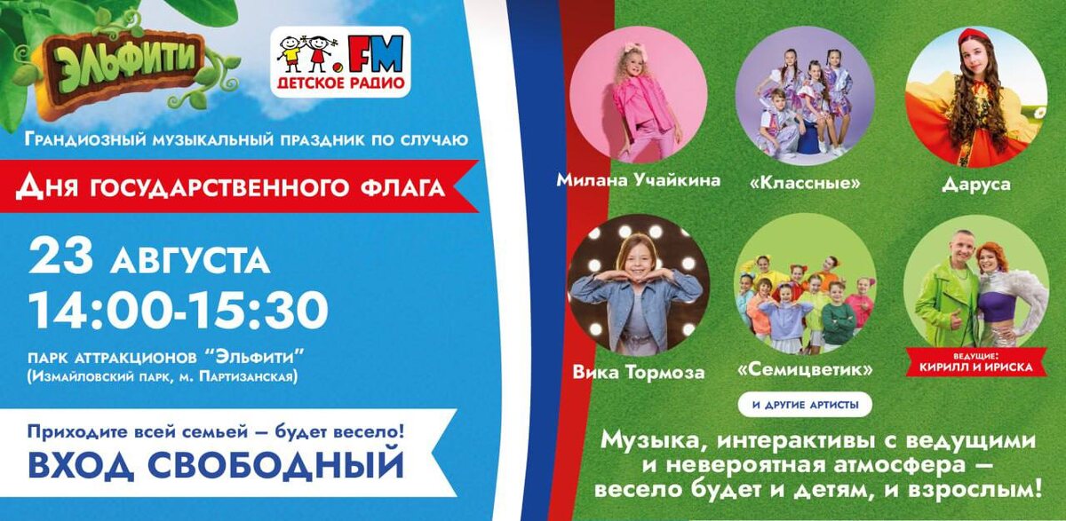 🆓 Музыкальный праздник в парке аттракционов «Эльфити» @prokachu в честь Дня Государственного флага! 🍄 🗓️23 августа в 14:00 📍Парк аттракционов «Эльфити» Измайловский парк, м. Партизанская Этот день обещает быть насыщенным весельем, музыкой и сюрпризами! 🎁 Детское радио — это радиостанция №1 для детей и родителей, которая уже много лет радует малышей яркими программами, интересными ведущими и любимыми песнями. В этот особенный день вас ждут: 🤩Море музыки, танцев и интерактивных развлечений 🤩Заряжающие отличным настроением ведущие Ириска и Кирилл Рассказкин 🤩Яркие выступления юных звезд: Вика Тормоза Егор Самсонов Анна Блудчая Варвара Почивалова София Наумкина «Киндерстар» «Классные» «Сияем» «Одноклассники» «Семицветик» Алиса Ди Даруса Милана Учайкина Нина Козакова Подробнее ЗДЕСЬ @Together_with_kids Пост носит информационный характер