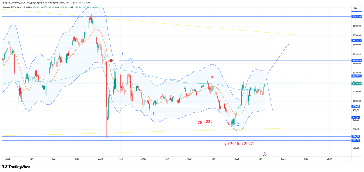 Ответ на этот вопрос в реакции индекса на уровень 1268. Пробой уровня отправит РТС на 1644. Если будет откат, тогда прогнозирую снижение к 948. Рост индекса РТС (RTSI) означает, что в целом акции, входящие в состав индекса, дорожают. Индекс РТС - это основной фондовый индекс российского рынка, рассчитываемый Московской биржей в долларах США. Он показывает изменение совокупной рыночной капитализации крупнейших и наиболее ликвидных российских компаний, представленных на Московской бирже. Вот что конкретно означает рост индекса РТС: В целом, рост индекса РТС - это позитивный сигнал для российского фондового рынка, который указывает на увеличение стоимости акций крупнейших российских компаний и улучшение настроений инвесторов. Больше инвестиционных идей и более подробные разборы активов читайте в моем телеграм канале. Ежедневно публикую теханализ недельного ТФ, дневки, четырёх-часовика с прогнозом движения цены актива. Мой телеграм канал: https://t.me/investory_MOEX Моя группа в Вконтакте