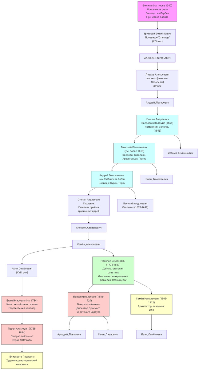 Фамилия Лазарев имеет русское происхождение и образована от мужского имени Лазарь. Имя Лазарь, в свою очередь, имеет древнееврейские корни и переводится как "Бог помог". В христианской традиции имя Лазарь связано с библейским персонажем, которого воскресил Иисус Христос. Фамилия Лазарев является отчеством, образованным от имени отца или предка, и в конечном итоге закрепилась как фамилия. Род Лазаревых в России включает в себя несколько ветвей, в том числе дворянские роды армянского происхождения и дворянские роды русского происхождения. Среди них выделяются Лазаревы-Станищевы, древний русский дворянский род, и Лазаревы, армянского происхождения. Лазаревы-Станищевы - это древний русский дворянский род. Род происходит, по преданию, от выходца из Цесарской земли (территория современной Германии или Австрии) по имени Филипп, который приехал в Москву к Ивану Калите и получил за это земли в Юрьево-Польском уезде. У Филиппа был сын Григорий, прозванный Станище, и внук Лазарь Алексеевич Стан
