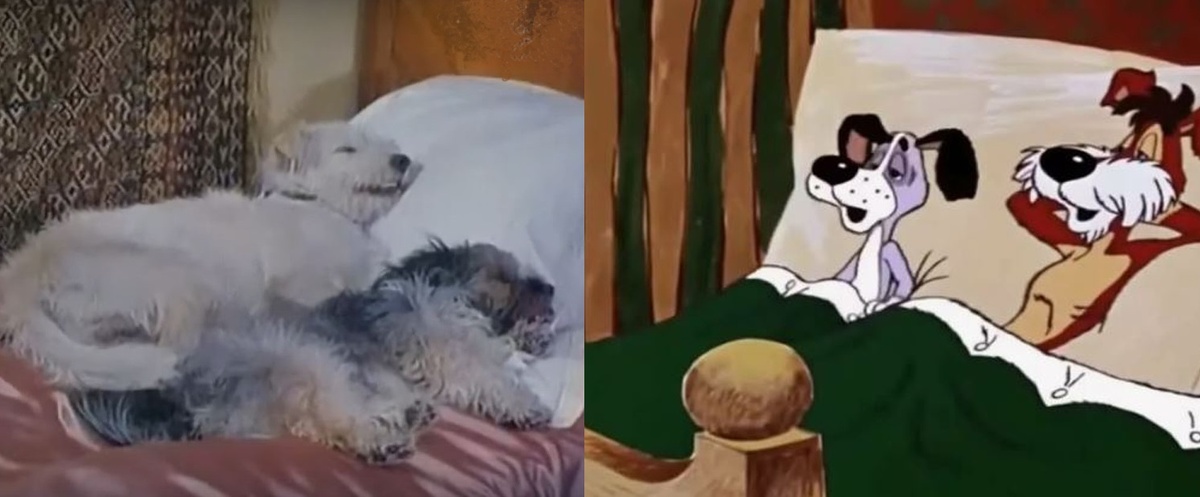 А вы знали, что у нашего чудесного мультфильма "Бобик в гостях у Барбоса" 1977 года выпуска есть предшественник, более ранняя версия? Оба фильма сняты по рассказу Николая Носова, того самого, что написал повести о Незнайке, и называется он "Бобик в гостях у Барбоса". Дата написания рассказа точно неизвестна, ориентировочно 50-е годы. Первая экранизация состоялась в 1964 году и называлась она наоборот - "Барбос в гостях у Бобика". Вторая состоялась 13 лет спустя и её название в точности соответствует названию рассказа. Сюжет у них ничем не отличается от первоисточника: одна собака живёт на улице, вторая в доме у почтенного дедушки, и однажды домашний пёс приглашает в гости уличного. Славно накуролесив, собаки укладываются спать на хозяйской постели, "а дедушка вон там в углу спит на коврике". И в самый разгар блаженного сна возвращается дедушка. Но интересно, что мультфильм 1977 года все помнят и любят, а первую экранизацию все уже забыли. Как же так получилось? На мой взгляд, ситуа