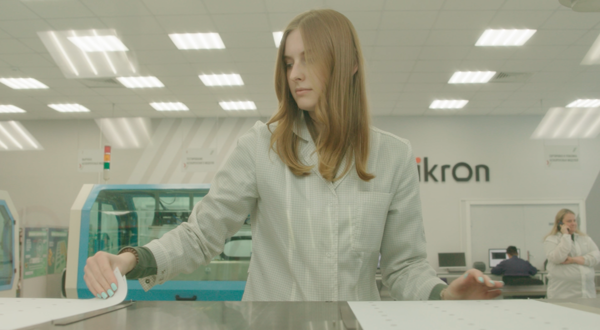 Отечественные чипы который каждый из вас так или иначе использует. Например, если вы возьмете свою транспортную карту — ее микрочип был скорее всего сделан здесь. Или микросхема для вашей банковской карты системы МИР — тоже может быть родом отсюда. Из г. Зеленограда, с производства с говорящим названием «Микрон». Но с чего все начинается? С таких пластин из монокристаллического кремния. Одно из условий, чтобы кремниевый диск стал микрочипом, к нему нельзя прикасаться руками. Его вообще трогать нельзя. То что я держу сейчас — просто демонстрационный образец. А рабочие диски внутри этой чистой комнаты перемещаются исключительно в контейнерах. Вопрос почему? Ответ: потому все транзисторы, резисторы, конденсаторы и полупроводники, что выращиваются на пластинах, не просто крошечные. Их габариты исчисляются микронами и НАНОметрами. Это меньше чем размер бактерии или вируса. Человеческий волос.. Да что там волос, пылинка, севшая на диск, может испортить структуру тысяч будущих микрочипов. По