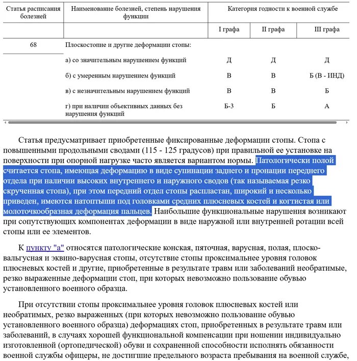 Полая стопа (pes cavus) – это аномалия строения стопы, характеризующаяся чрезмерно высоким продольным сводом. В отличие от плоскостопия, при полой стопе свод стопы избыточно приподнят, а нагрузка распределяется неравномерно. За консультацией обратился призывник с жалобами на боли в стопах при беге, длительной ходьбе, длительных статических нагрузках. В 565 постановлении- "Об утверждении Положения о военно-врачебной экспертизе", отсутствуют четкие рентгенологические критерии для установки диагноза полая стопа, подробно прописаны данные объективного осмотра. По данным объективного осмотра диагноз полые стопы подтверждается, в дальнейшем для военкомата потребуется рентгенография стоп с нагрузкой, конс. травматолога-ортопеда. Категория годности по ст.68 а-Д(не годен к в/сл). https://t.me/MME_SurgeryRadiolodgy https://vk.com/club223629464