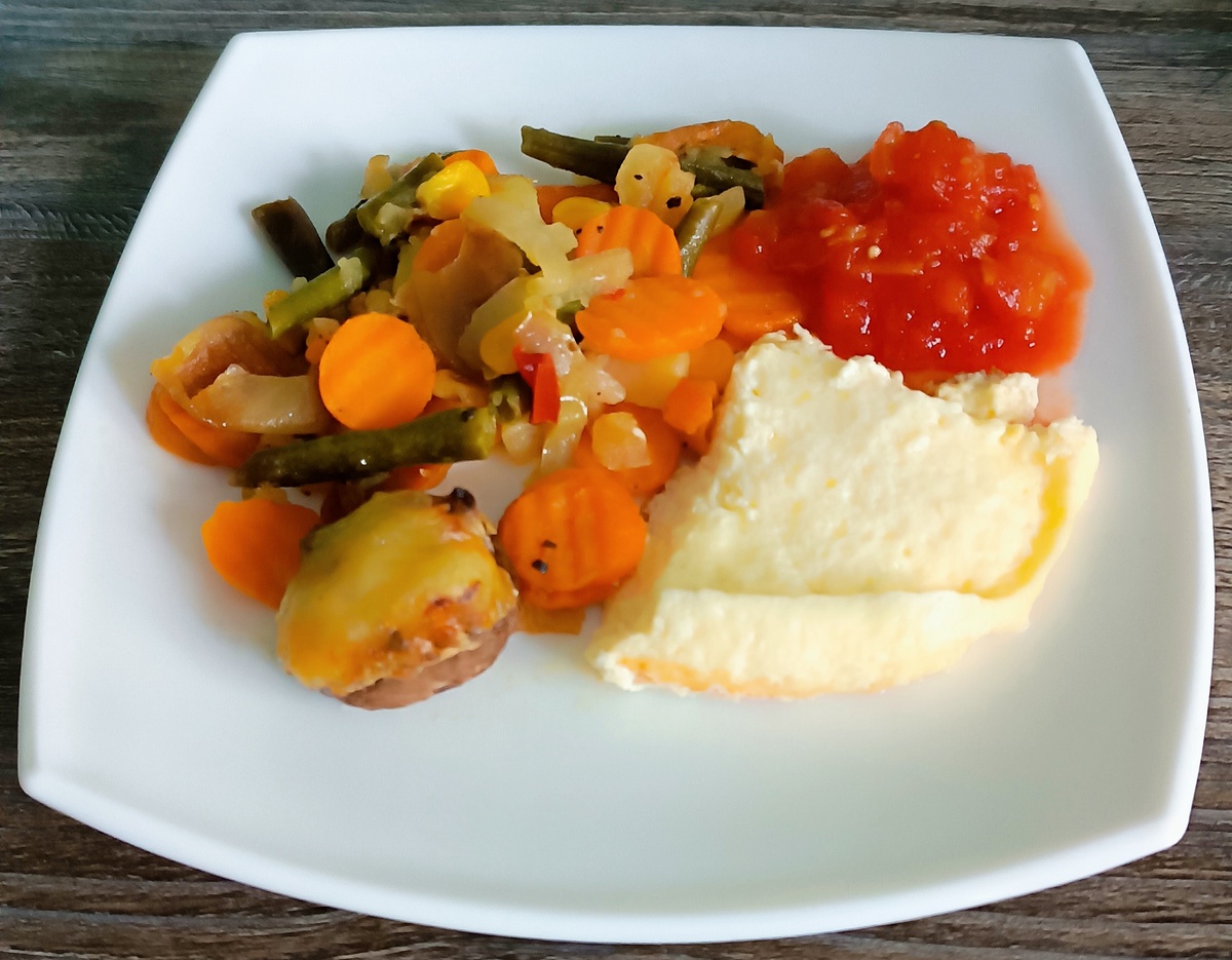 Овощи из морозилки, там на упаковке написано - приготовлено так-же, как на упаковке. Томаты в собственном соку - ну уж тут никто не ошибётся, просто зачерпнуть из банки. Гриб с сырной шапочкой - это довесок. Ну один остался, после моего кропотливого приготовления, по рецепту, надо доесть.