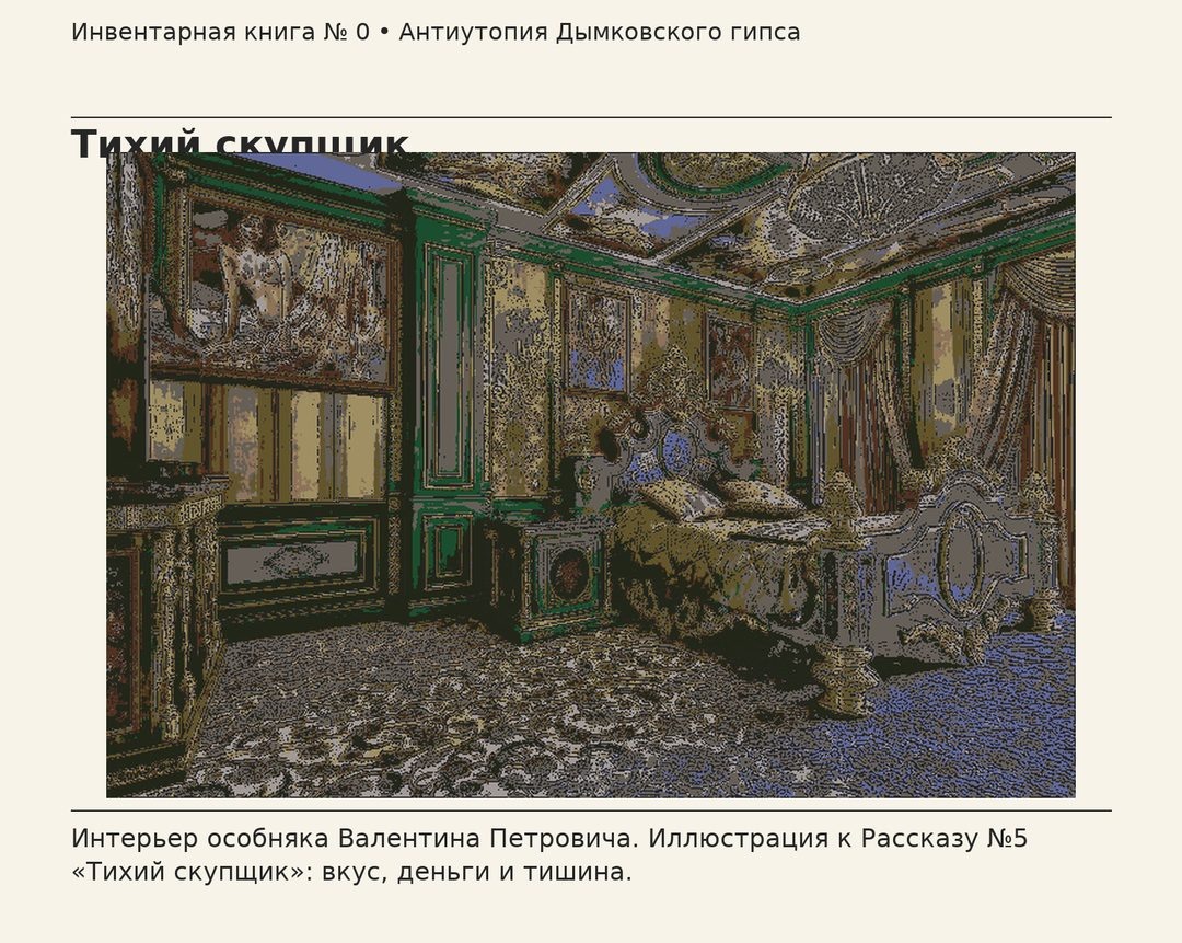 Валентин Петрович тем временем упрочил клей в собственной легенде. Он водил гостей по залу, где на постаментах стояли «русские, татарки, еврейки, мордвины, башкирки, поляки» — вся дореволюционная география в гипсе, выстроенная в линию, как стенд на выставке достижений частного капитала. По воскресеньям он ел серебром и смотрел на «родню». Каждая буква в фамилии грело изнутри ту самую несбывшуюся голубую кровь.