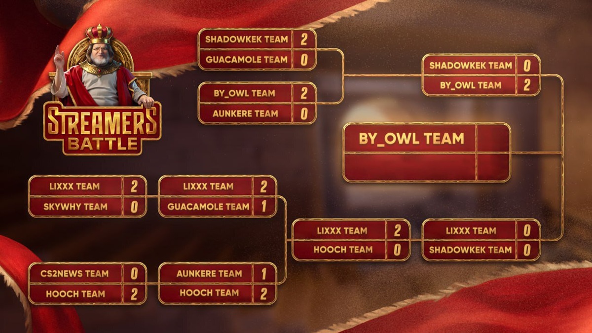 Кто выиграет турнир? BetBoom Streamers Battle #3 – медиа-турнир по CS, в котором участвуют стримеры, действующие и бывшие киберспортсмены (причем не только каэсеры, но и докеры), футболисты и даже рэперы. В этом посте – расписание плей-офф. 📌Все про бан Смолова: угрожал «дать леща», называл Аункера «ослом» Сетка плей-офф BetBoom Streamers Battle #3 📌Список участников BetBoom Streamers Battle CS 2 16 августа Полуфинал верхней сетки: 16:00 Team Shadowkek 2-0 Team Guacamollly Первый раунд нижней сетки: 19:00 Team LIXX 2-0 Team Skywhywalker 17 августа Полуфинал верхней сетки: 16:00 Team Aunkere 0-2 Team By Owl Первый раунд нижней сетки: 13:00 Team CS2News 0-2 Team Hooch Четвертьфиналы нижней сетки: 19:00 Team Aunkere 1-2 Team Hooch 22:00 Team Guacamollly 1-2 Team LIXX 18 августа Финал верхней сетки: 17:00 Team Shadowkek 0-2 Team By Owl Полуфинал нижней сетки: 20:00 Team Hooch 0-2 Team LIXX 19 августа Финал нижней сетки: 15:00 Team Shadowkek – Team LIXX Гранд-финал 18:00 Team By Owl – Tea