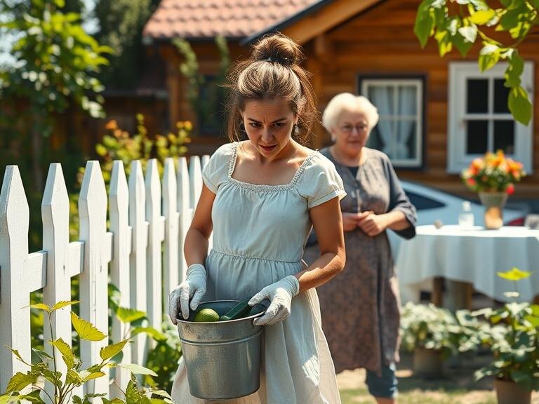 Она вышла на террасу с ведром. И застыла. Во дворе — Лариса Ивановна. Свекровь. В костюме цвета «заплесневелая груша» и белых перчатках. Рядом — паренёк в клетчатой рубахе, с планшетом, всё меряет участок шагами, записывает.