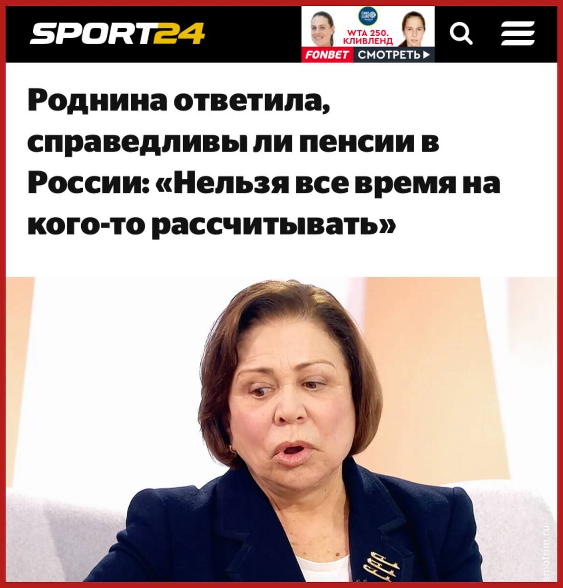 Фигуристка, чемпионка Олимпиад 1972, 1976, 1980, депутат ГД Ирина Роднина считает, что с пенсиями в России надо поступить как в США: «В Америке человек создает пенсию себе сам, а наши граждане в своей пенсии практически никак не участвуют» Похоже, депутат не в курсе, как формируется пенсионный фонд и сколько люди отдают в него денег. Кстати, из налогов, которые платят люди, депутаты ГД получают з/п. Но Роднина, видимо, считает, что её з/п берется из банкомата При этом депутатов попеняла гражданам, жалующимся на работу госорганов: «Мы все время ставим вопрос о том, что должно государство. А делает ли население для своей страны столько, чтобы ей было комфортно создавать такие условия?» Конституция для депутата - пустой звук? Там же написано, что государство для человека, а не человек для государства. Поэтому ей в СССР дали возможность БЕСПЛАТНО заниматься фигурным катанием. И даже если бы она не выиграла Олимпиады, никто бы у неё денег, затраченных на обучение, назад не попросил Але