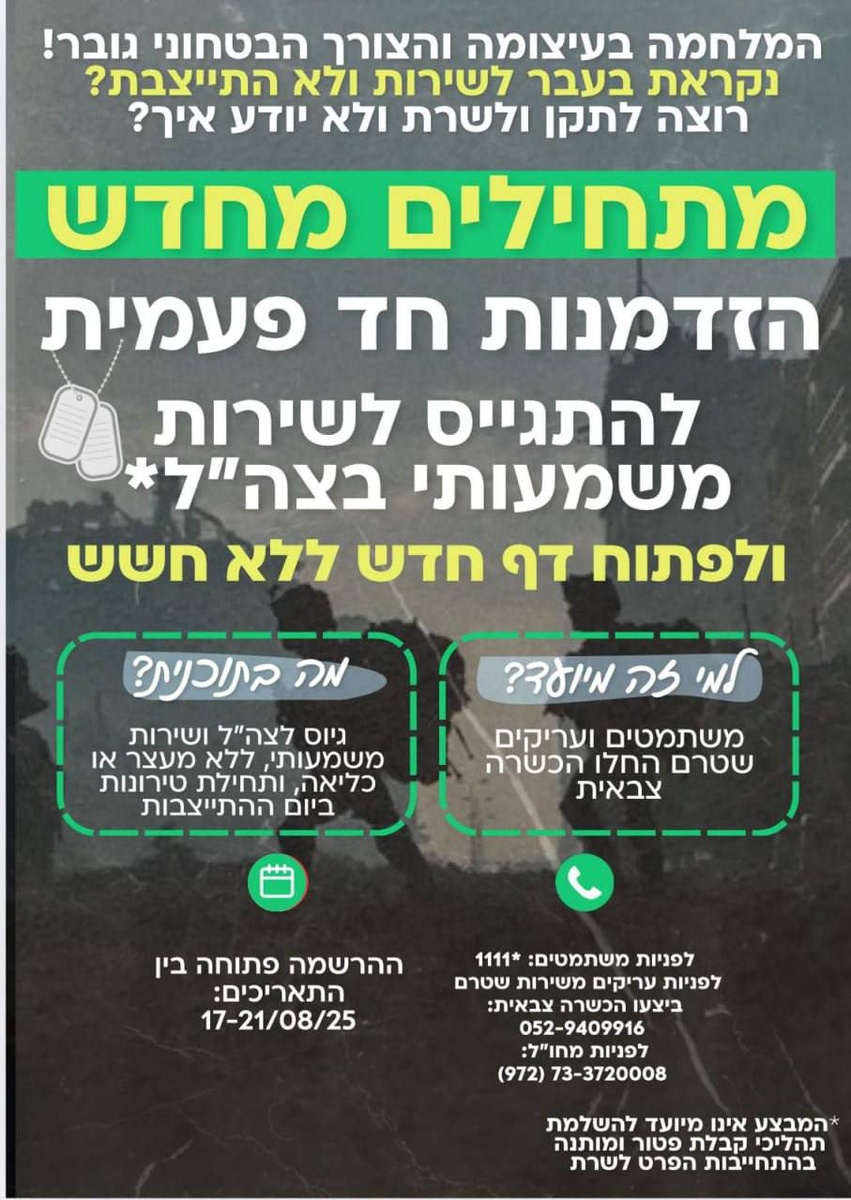 Армия обороны Израиля (ЦАХАЛ) заявляет, что предоставит уклонистам от призыва — многие из которых являются членами ультраортодоксальной общины — единовременную возможность вступить в армию без наказания за дезертирство. Около 14600 израильтян — мужчин и женщин — числятся в Управлении персонала ЦАХАЛа как уклонисты и дезертиры, включая тех, кто начал процесс призыва, но так и не был призван, а также тех, кто игнорировал повестки длительное время. Все они потенциально могут быть приговорены к тюремному заключению за отказ от призыва, однако применение наказаний было ограниченным. В течение пяти дней, начиная с сегодняшнего вечера и до 21 августа, этим израильтянам будет предоставлена «последняя возможность» зарегистрироваться для призыва без угрозы тюремного заключения в рамках операции ЦАХАЛа под названием «Начать заново». Военные сообщают, что направят уведомления уклонистам с возможностью зарегистрироваться через ссылку в SMS-сообщении или позвонив в подразделение Мейтав, ответстве