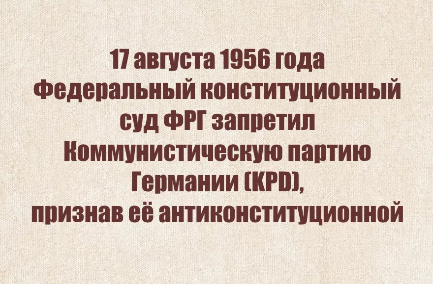 17 августа 1956 года в Западной Германии прогремел юридический гром: Федеральный конституционный суд в Карлсруэ одним росчерком пера стёр с политической карты страны Коммунистическую партию Германии (KPD). Это было не просто решение суда - это был сильное решение молодой демократии, которая, едва встав на ноги после кошмара нацизма, отчаянно защищала себя от новой тени тоталитаризма. За этим актом скрывалась не только борьба за выживание, но и мучительный выбор - как далеко может зайти государство, чтобы спасти свободу, не утратив её самой? Германия 1950-х. Страна разорвана надвое. На востоке - ГДР, где коммунистический режим под пятой Москвы душил всякую надежду на свободу. На западе - ФРГ, юная, хрупкая демократия, всё ещё дрожащая от воспоминаний о Веймарской республике, павшей под натиском радикалов. Основной закон 1949 года стал для неё щитом, а идея "воинствующей демократии" - мечом, которым она готова была рубить любые угрозы. Коммунистическая партия Германии, рождённая в 1919 г