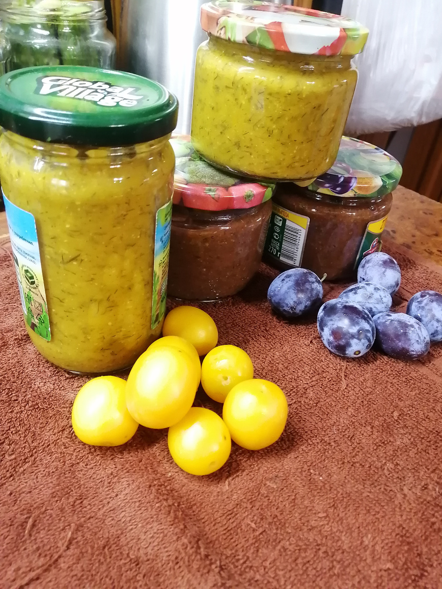 Ткемали у меня из двух видов сливы. Жёлтой сладкой алычи и сливы венгерка. Решила попробовать один рецепт на двух видах сливы. Рецепт нашла на просторах интернета, так что на авторство не претендую. Сливы 1кг, Укроп и петрушка по 20 грамм, Чеснок - 1 средняя головка, Мята сушеная- 1 ст л, Хмели сунеои-2 ч л, Перец молотый чили-1/4 ч л, Сахар-2 ст л с верхом, Соль-1,5 ч л. Внимание!!! С сахаром будьте внимательны. Я в алычу дала 2 ст л, и ткемали все одно с кислинкой, а в сливу фиолетовую дала 1 ст л и ткемали слаще. Тут ориентируйтесь на свой вкус. И ещё по поводу косточки, косточку можно вынуть сразу, а можно после того, как протушите. Тут ваш выбор. Я вынимала косточки после тушения, это не долго. Сливы в кастрюлю и на медленном огне тушить без воды.. Алыча более мягкая, она разошлась быстрее. В слива венгерка тушилась часа полтора. Протереть через сито. Алыча вообще вся, протерлась, без отходов. А у синей сливы кожуры где то столовая ложка получилась. Зелень ре