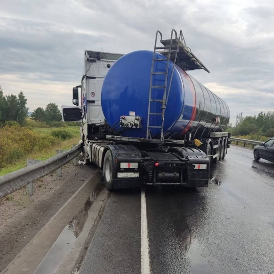 На трассе «Р-255 «Сибирь»грузовик врезался в отбойник. Обошлось без пострадавших. 17 августа на 117 километре автодороги "Р-255 "Сибирь" произошло ДТП с участием грузового автомобиля. По предварительной информации, мужчина 1973 года рождения, управляя грузовым автомобилем "КамАЗ" в составе полуприцепа-цистерны, не справился с управлением и совершил наезд на отбойник. В результате ДТП пострадавших нет. На месте работают сотрудники Госавтоинспекции. Обстоятельства произошедшего устанавливаются. #adr #сложило в #ножницы