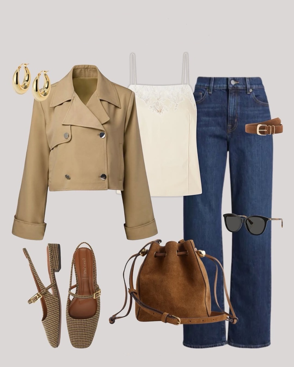 Вещи: укороченный двубортный тренч цвета «беж латте» с крупными лацканами и отворотами рукавов; молочный сатиновый топ с кружевной планкой; тёмно-синие прямые джинсы без сильного вываривания; ремень коньячного оттенка; закрытые «mary jane» на невысоком каблуке в коричневую гусиную лапку; сумка-мешок из коричневой замши; лаконичные золотые серьги-кольца и чёрные очки «кошачий глаз».
