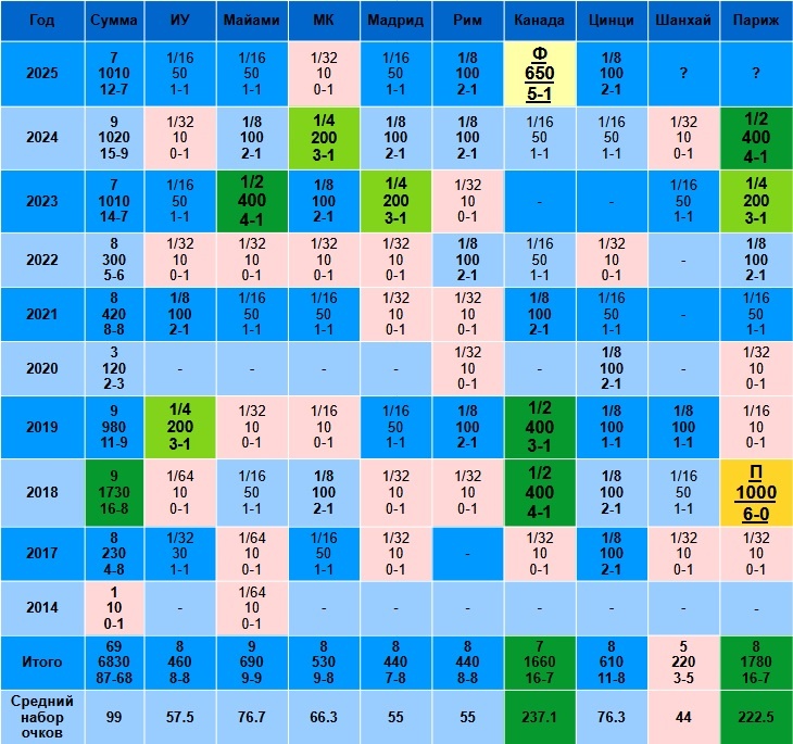 Париж и Канада – лучшие, по 16 побед. Цинциннати – третий, 11 побед. На остальных Мастерсах от 3 до 9 побед.