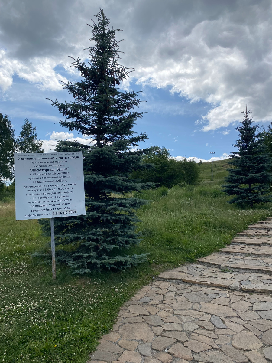 Добравшись до вершины, взгляду предстает сторожевая башня, построенная в XIX веке. Она служит ярким символом истории города и раньше использовалась для наблюдения за пожарной обстановкой. Внутри башни расположен небольшой музей, посвящённый истории Нижнего Тагила, хотя в нашем визите попасть внутрь не удалось, так как двери были закрыты.