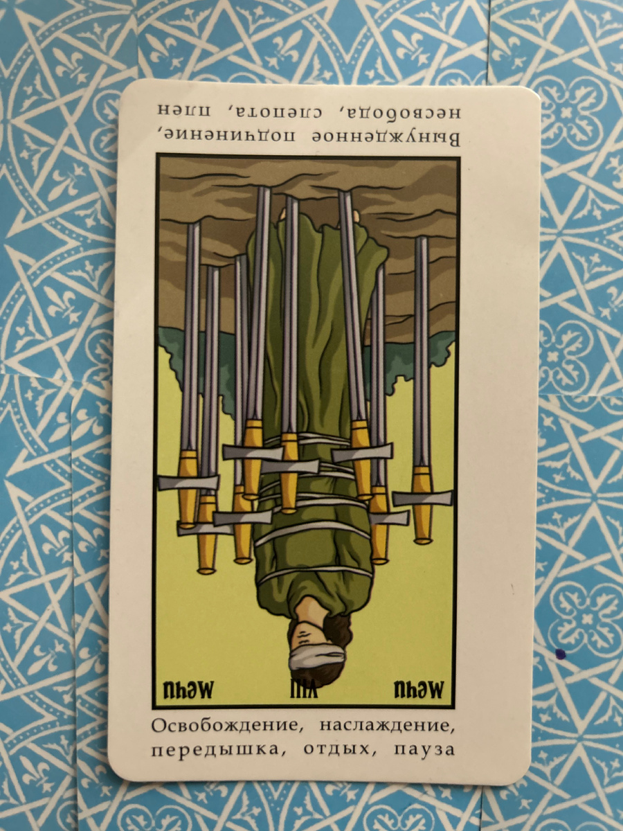 Когда внезапно понимаешь: клетка была открыта всегда. В прямом положении эта карта про ограничения, страхи, ощущение «связанности по рукам и ногам», когда кажется, что выхода нет. Но в перевёрнутом — приходит осознание: многие из этих цепей были лишь иллюзией. Выход есть, и он ближе, чем казалось. Это момент освобождения от старых страхов и привычки драматизировать. 1. Снятие ограничений. Проблема оказывается не такой страшной. 2. Выход из тупика. Вдруг приходит ясность и решение. 3. Отпускание страхов. Перестаёте бояться действовать. 4. Прорыв через внутренний барьер. Хватит ждать — пора шагнуть. 5. Понимание иллюзии. Вы осознаёте: всё это время вас держали лишь собственные мысли. В любви и отношениях: Если были зависимость, контроль или чувство, что «никуда не деться», перевёрнутая карта указывает на освобождение. Понимание, что партнёр не диктует всю вашу жизнь, и вы вправе выбирать. В работе: Появляется шанс выйти из стресса и давления. Находится решение проблемы, которая казалас