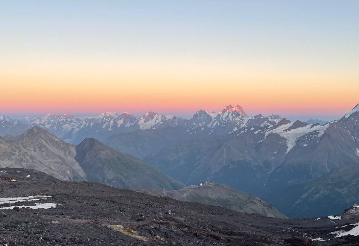Вот я опять на приюте на высоте 3900 метров. На этот раз всё было без физических упражнений, потому что с группой. На канатке мы поднялись на приют, заселились в уютные домики. То есть наши участники заселились в уютные домики. Я же заселилась в небольшую конуру под названием гидская. Правда, главная радость, что сейчас на горе только наша группа, так что я там одна. А для одного - это просто шикарное помещение. Потом у нас были снежные занятия. То есть сперва мы с моими коллегами подогнали тринадцать пар кошек под тринадцать пар ботинок и научили надевать одно на другое. После этого выдвинулись в путь, осваивая технику хождения на кошках. А дойдя до хорошего снежного склона на высоте 4100 начали весело кататься по склону, пытаясь остановиться. Это самая веселая часть занятия. Ещё у нас была тренировка, когда все учились надевать страховочные системы. И конечно же были вкуснейшие обед и ужин. И совершенно живописнейший закат.