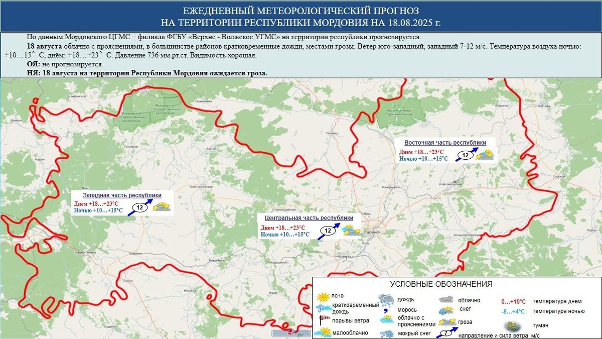 ☁️⛅⛈️ 18 августа в Мордовии облачно с прояснениями, в большинстве районов кратковременные дожди, местами грозы. Ветер юго-западный, западный 7-12 м/с. Температура воздуха ночью: +10…15°С, днём: +18…+23°С. Давление 736 мм рт. ст. Происшествия | Подписаться | Предложить новость