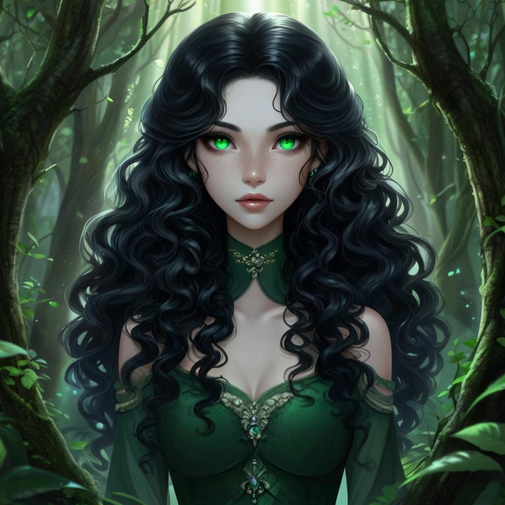 На меня смотрела худенькая девчушка, но какая же она была красивая! Волосы цвета воронова крыла обрамляли лицо с тонкими чертами. Большие, изумрудно-зеленые глаза лучились озорством и любопытством. Кожа, словно лепесток белой лилии, казалась нежной и бархатистой. Она была одета в платье (или блузку?) идеально сливавшееся с окружающей зеленью.