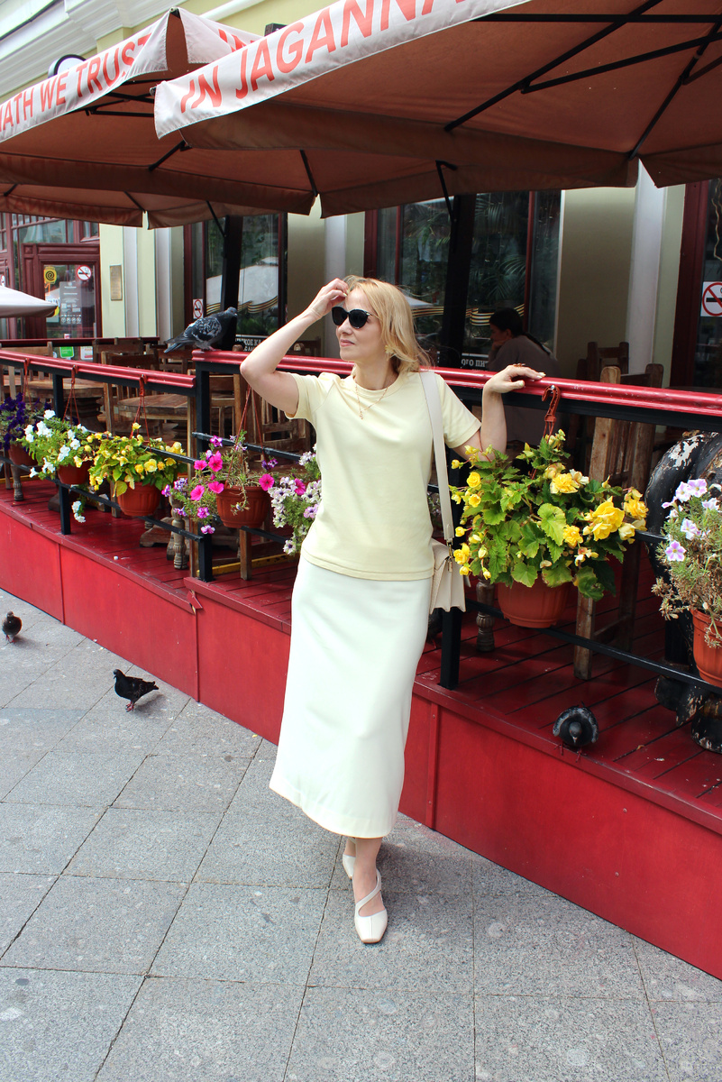 Мода - это не только про тренды, но и про умение создавать гармоничные образы с характером. Если хочется выглядеть стильно и современно, необязательно гнаться за каждым новым веянием, достаточно освоить несколько проверенных приёмов, которые работают вне времени. В этой статье расскажу про два моих любимых приёма, с помощью которых легко собирать эффектные луки - монохром и многослойность. 1. Монохром Монохромная одежда обладает способностью создавать гармоничный образ без особых усилий. Даже если образ был выбран в спешке, он выглядит аккуратно и стильно и смотрится как тщательно продуманный. Кроме того, монохром визуально удлиняет силуэт и создаёт стройнящий эффект. Не каждая вещь должна быть в точности того же цвета - можно использовать слегка отличающиеся оттенки или текстуры, чтобы наряд не выглядел слишком однообразным и скучным. Я часто использую этот приём в своих аутфитах. Например, в этом образе я сочетаю юбку в модном оттенке "сливочное масло" и чуть более яркую футболку. С