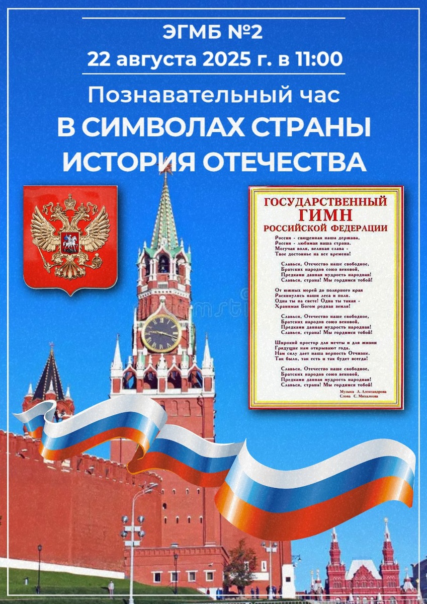 Анонс. Познавательный час «В символах страны – история Отечества»🇷🇺 22 августа в 11:00 в ЭГМБ №2 пройдет мероприятие, посвященное Дню государственного флага Российской Федерации. Этот знаковый праздник олицетворяет единство и гордость нашей нации, и в этот день каждый гражданин России выражает свое уважение к государственным символам Родины. На мероприятии мы рассмотрим историю создания российского флага, значения его цветов, а также те случаи, когда поднимается флаг Российской Федерации. Также будут затронуты интересные факты о геральдике нашей страны и о том, как на протяжении первых пятисот лет своей истории Россия не имела ни герба, ни флага, ни гимна; вы узнаете, какую роль в средние века исполняла чудотворная икона, с которой шли в бой княжеские дружины. Кроме того, ребятам будет предложено поучаствовать в экспресс-викторине по теме истории флага «Знаешь ли ты?». Также участникам мероприятия покажут видеоролик «Флаг России»
