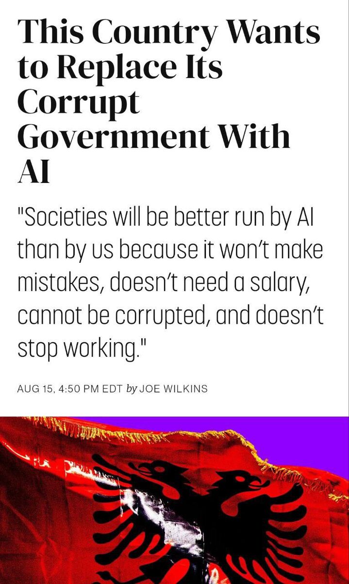 Заменить правительство ИИ предложили в Албании. Граждане страны устали от коррупции и бюрократии среди высших чиновников. Сам премьер Алабании выдвинул идею о том, что избиратели смогут доверить кресла в совете министров нейросети. Плюсы очевидны: повышение прозрачности управления. Искусственный интеллект не берёт взяток, не требует зарплаты, работает круглосуточно и без сбоев. Такая модель сделала бы Албанию первой страной в мире, где нейросеть будет представлена в правительстве.