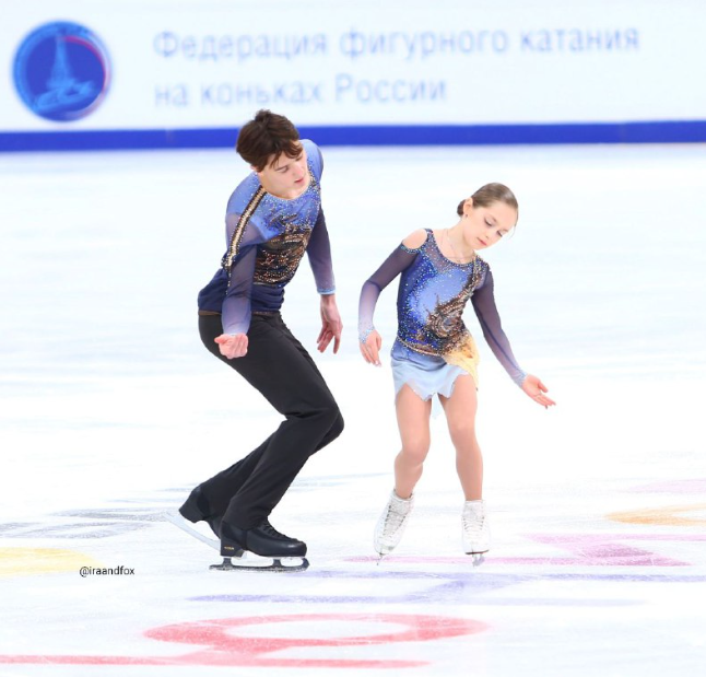 Кира и Илья оставили произвольную с прошлого сезона. Она яркая, запонимающаяся и очень идет самим ребятам. Отлично, что уже в августе удается собрать неплохой прыжковый набор. Каскад из тройного прыжка и двух двойных акселей уже практически обязательный даже для юниорской программы. В прошлом году не всегда ребятам удавалось его прыгать, помнится, каскад был более простым, а теперь партнерша, вероятно, слегка подросла и техника снова устаканилась. Очень обидно, что с тулупа случилось падение, но все же оно не помешало показать программу. Что же, еще сезон поностальгируем о пионерах и мечтах о светлом будущем.