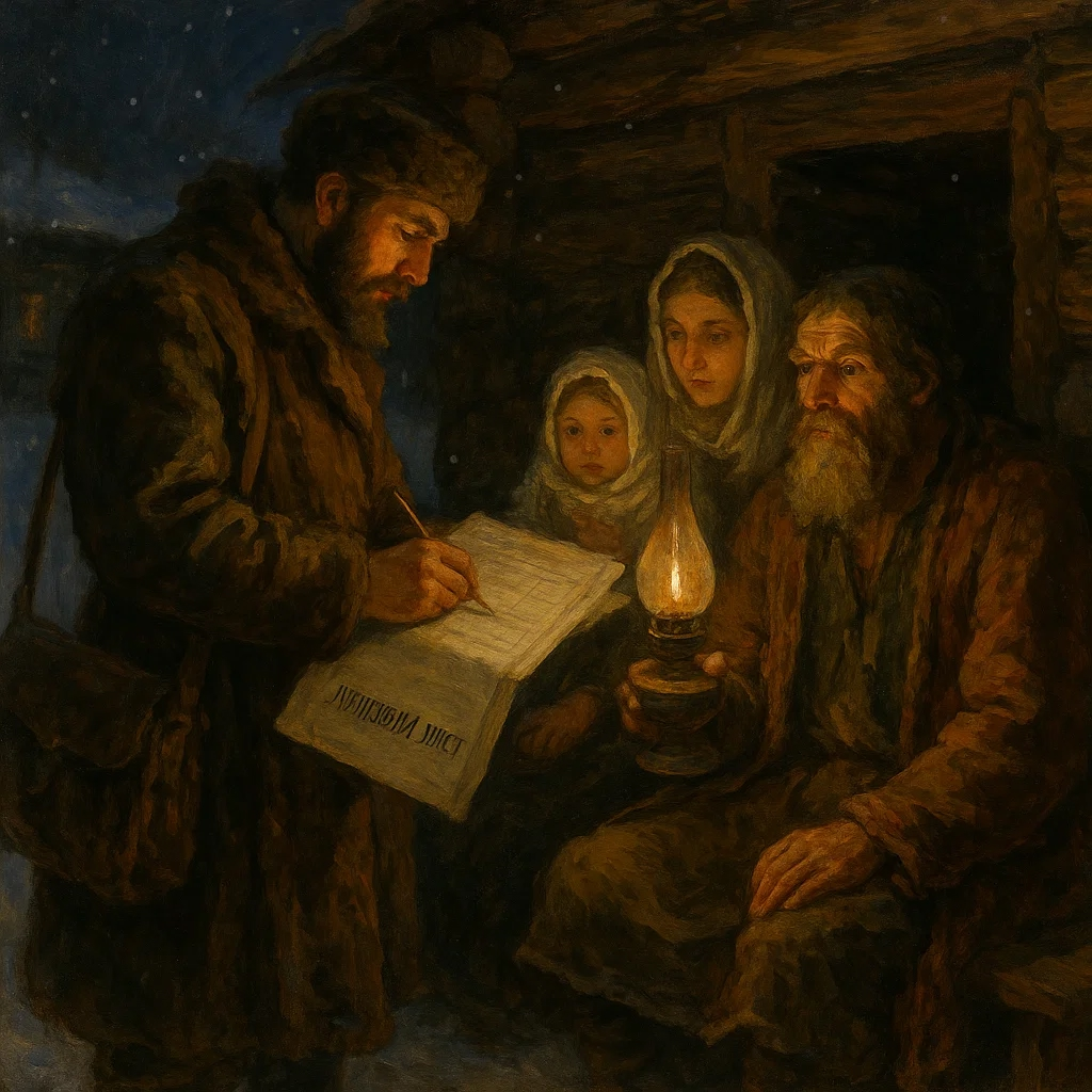 Зима 1897 года выдалась снежной и тихой. В губернских городах — скрип полозьев, в столицах — редкий стук копыт по замёрзшей мостовой. В эту ночь двери по всей стране должны были открываться на один и тот же стук: переписчик. У каждого — кожаная сумка, толстая инструкция, карандаш и кипа бланков. На крышке — аккуратно выведено: «Лицевой лист». Им велено спрашивать всех одинаково — от купца первой гильдии до бродячего подмастерья, от квартиранта на Песках до старушки в далёкой тундровой тонье. Никаких «знаете ли вы, кто я?» — только вопросы, только ответы. В городе переписчику легче: адресные столбы, номерные таблички, дворники, готовые постучать в нужную дверь. Но и здесь хватает сюрпризов. Открывает мастер на Сенной и, не дав слова сказать, бурчит: «Детей записывать не велено! Потом в рекруты заберут». Переписчик упрямо показывает инструкцию: рекрутчины давно нет, перепись не призыв. Плечи мастера опускаются — «пишите». И диктует: семья, вероисповедание, род занятий. Доходы спрашивать