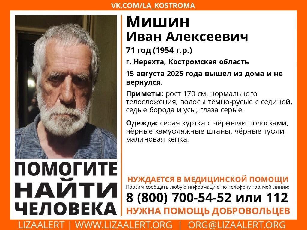 Мужчина нуждается в медицинской помощи Костромской отряд ЛизаАлерт опубликовал на своей странице в соцсетях объявление о сборе добровольцев для поиска Мишина Ивана Алексеевича. 15 августа в Нерехте он вышел из дома и не вернулся. Мужчине 71 год, нормального телосложения, с серыми глазами, темно-русыми волосами, седыми усами и бородой. На нем был черный камуфяж и малиновая кепка. Мужчина нуждается в медпомощи. Инфорги: Dream (Наталия) телефон 8 20)383-57-64Чайка (Ирина) телефон 8 915918-68-32. Любую информацию о Мишине Иване Алексеевиче можно сообщить по телефону: 8 800 700 54 52 или 112.
