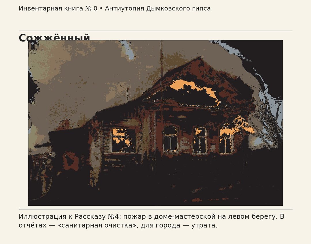 Но в ту ночь было то, чего не слышат отчёты: треск гипса, который не горит, а белеет; глухой стук постамента, не терпящего одиночества; хлопок воздуха, когда форма падает на пол и никто уже не поднимет её за ребро — продолжить «Народы и типы России». Дом, где делали лица, сложился внутрь себя и стал пеплом. В пепле остались белые дорожки — как крошка мела на школьной доске. По ним можно прочитать имена. Бумаге читать некогда.