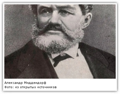 Александр Миддендорф родился в Санкт-Петербурге в семье педагога. В 1837 г. окончил медицинский факультет Дерптского университета. Стажировался в Австрии и Германии, специализировался в области зоологии, этнографии, антропологии. В 1839 г. назначен адъюнктом при кафедре зоологии в университете Святого Владимира (Киев). В 1840 г. участвовал в Лапландской экспедиции К.М. Бэра, собирал материалы по орнитологии, малакологии и геологии Лапландии. В 1842 г. Петербургская Академия наук поручила Миддендорфу организовать экспедицию в Восточную Сибирь. Во время экспедиции 1842 − 1845 гг. открыл плато Путорана, стал первым исследователем полуострова Таймыр, Северо-Сибирской низменности, Амурско-Зейской равнины, Станового хребта, нижней части бассейна Амура, южного побережья Охотского моря, Шантарских островов. Отчёт Миддендорфа был наиболее полным естественно-историческим описанием Сибири того времени. В числе научных достижений — первое этнографическое описание ряда сибирских народов и первая научная характеристика климата Сибири, определение южной границы распространения вечной мерзлоты и др. В 1852 г. избран академиком Петербургской Академии наук. В 1867 — 1896 гг. сопровождал в путешествиях по России великих князей Алексея Александровича и Владимира Александровича. В 1870 г. исследовал Барабинскую степь, в 1878-м — Ферганскую долину. В 1883 г. министерство государственных имуществ поставило Миддендорфа во главе экспедиции по изучению скотоводства в России. Во время экспедиции Миддендорф тяжело заболел. Последние годы жизни провел в своем имении Гелленорм (ныне Эстония). Скончался в 1894 г.