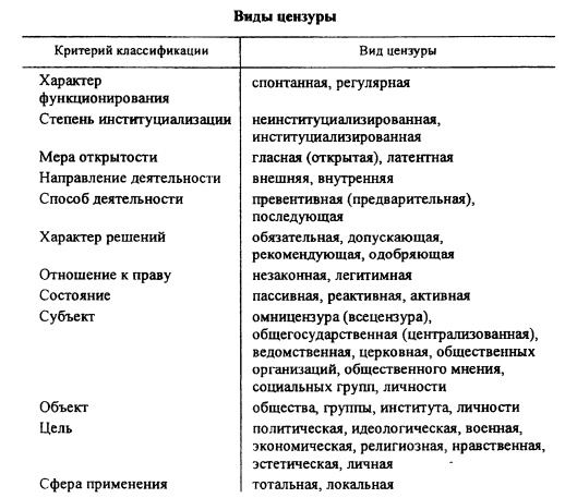 Вот приблизительно такую классификацию видов цензуры можно без труда найти: