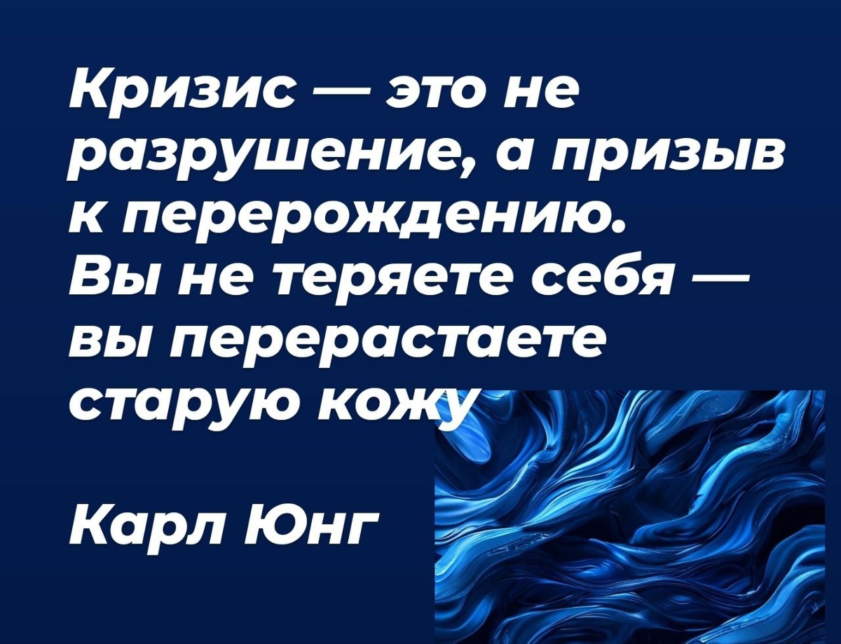 🔴 Как думаете почему кризис - перерождение? Цитата Юнга — ключ к пониманию любого кризиса: возрастного, профессионального, личностного. ❗️Старая кожа — это устаревшие роли, убеждения, цели, которые больше не соответствуют вашей сути. ❗️"Перерасти" — значит осознать: вы не исчезаете, а трансформируетесь. ❗️Кризис — сигнал психики: "Пора сбросить то, что мешает двигаться дальше!" 🔴 Пример из практики: Клиент (47 лет) считал кризис "концом жизни": карьера на пике, но радости нет. В терапии он понял: это не крах, а запрос на новые смыслы. Через год он открыл реставрациоенную мастерскую, о которой мечтал в юности. 🔴 Как использовать кризис для перерождения? 1. Перестать бороться с кризисом (это не враг, а союзник!). 2. Задать себе вопросы: "Какая часть меня "умирает"? "Что хочет родиться вместо этого?" 3. Довериться процессу. Даже змея не может двигаться вперед, не сбросив кожу. 🔴 Хотите пройти кризис осознанно? 🔹 Книга "Уроки отношений" - https://clck.ru/3NJmTb 🔹 К