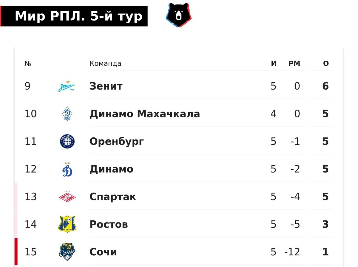 После пятого тура Мир РПЛ московский «Спартак» – на 13-м месте, в зоне стыковых матчей.