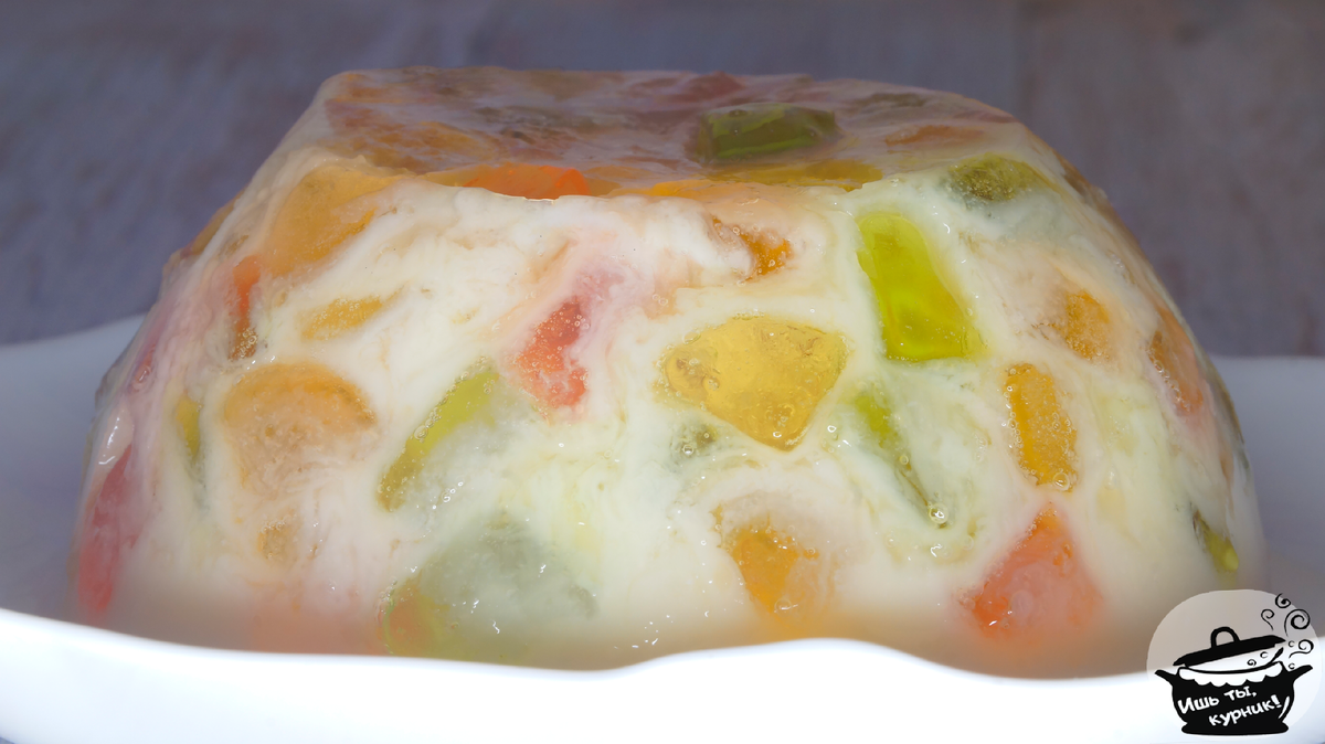 Ингредиенты: желатин 200 блюм - 15 гр.; молоко - 200 мл.; мармелад - 250 гр. Приготовление: желатин замочить согласно инструкции в 100 гр. молока. Мармелад нарезать небольшими кубиками. Набухший желатин растопить на водяной бане, объединить с остатком молока, перемешать и залить мармелад. Убрать в холодильник на 4 часа. Приятного аппетита!