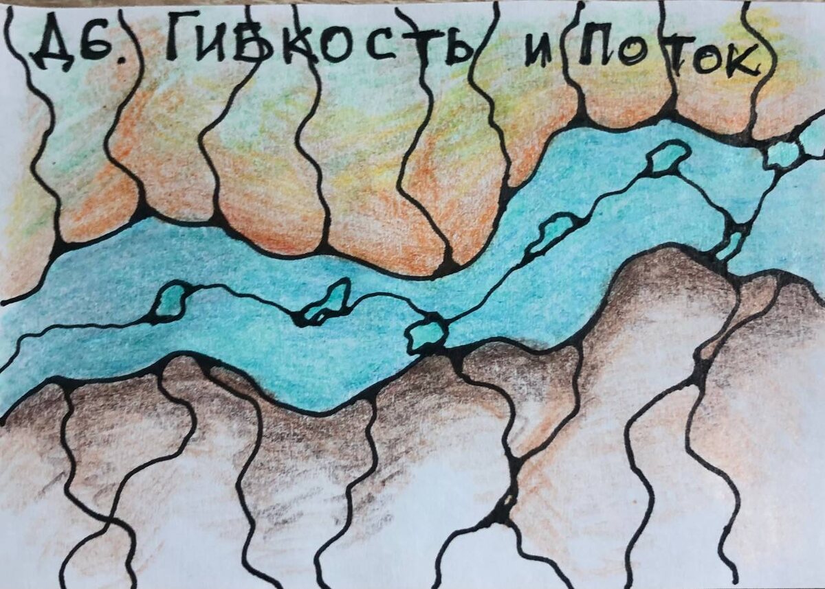 Описание задания дня. Берите маркер и карандаш – ваша женственность ждет трансформации! Готовы к практике? Вот подробная инструкция для шестого дня вашего нейрографического путешествия. Помните: цель – ощущения, а не идеальный рисунок! - лист бумаги А5/А6 или размер листа для заметок (10Х10см). - линер, средний маркер. - цветные карандаши, которые откликаются сегодня. 1. Вспомните ситуацию, где гибкость помогла вам. 2. Нарисуйте две непрерывные линии от одного края листа до другого, как бы образуя речной поток. Пусть он сужается и расширяется, как река. 3. Избегайте резких углов! Только плавные изгибы. 4. Добавьте линии в фон: снизу-вверх до нижней линии (ваши ресурсы) и от верхней линии вверх (ваши возможности). 5. Закрасьте пространство между линиями бирюзовым/сине-зеленым – это русло вашего потока. 6. Можно добавить маленькие «капельки» по ходу линии. Это ваши внутренние импульсы, толкающие вас вперед. 7. Внесите цвет по своим ощущениям. 8. Не забудьте про Линию Поля и фигуру Фиксац