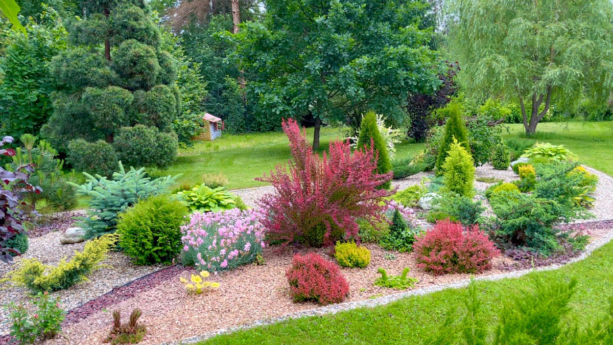 Горные сосны, миниатюрные елочки, туи, невысокие или стелющиеся можжевельники; лиственные кустарники — спиреи, барбарисы и др.; из многолетних травянистых растений - злаки, низкорослые колокольчики, очитки, молодило, камнеломки, армерия, тимьян, гвоздика и др.