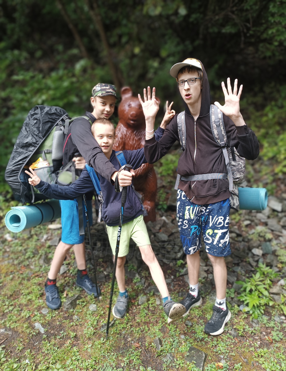 Все может пойти по другому сценарию... Проснулись от шума дождя. Выглянув из палатки поняли, что чистой воды из речки мы не наберём. От дождя она стала мутной. Тогда мы решили насобирать дождевой. Достали посуду (тарелки) и расставили под край палатки, чтоб с крыши стекало в посуду. Ждали полчаса. Затем все слили в чайник и накипятили. Таким образом попили горячего чая с печеньками. Мимо нас прошла группа туристов из пятнадцати человек в дождевиках...так себе радость идти под дождем. Пока мы прикидывали во сколько выходить и что делать дальше, дождь закончился. Мы решили выдвигать немедленно. Быстро собрали палатки, спальники, вещи. На рюкзаки натянули дождевики. Выдвинулись. Первый кордон Черноречье. Постучали, позвонили в колокол. Собака залаяла. Тогда появился мужчина. Открыл ворота. Внимание! Ворота только с одной стороны тропы. И здесь строго! Вход с 8.00 до 18.00! Выйти можно в любое время. Сначала посмотрел нашу бумажку, записал в свой журнал, что мы вошли. Собака нас обнюхала.