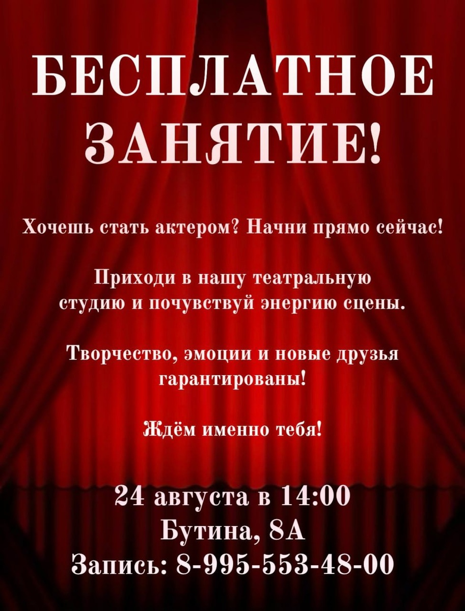 Ух ты! Нас тут с вами приглашают на бесплатное пробное занятие в театральную студию Говорят, там каждый найдёт друзей, раскроет свои эмоции и научится творить настоящие чудеса на сцене. 🕐24 августа, 14:00 📍Бутина, 8а 🔑запись по телефону: 89955534800 #Новости Предложить публикацию @zabkulisye_bot
