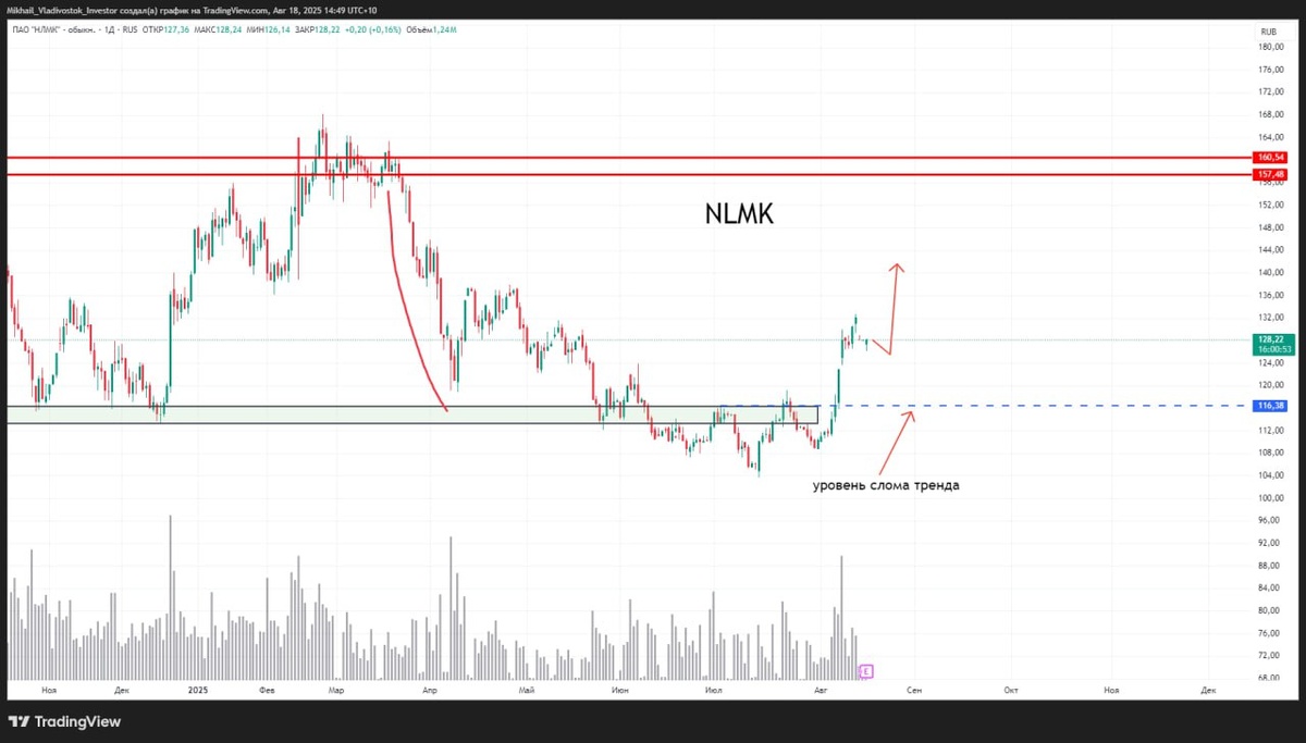 ГЛОБАЛЬНО ИНТЕРЕСНЫЕ #акции РФ на предстоящую неделю Много конечно акций оказалось у меня в листе на лонг. выделю самые самые на мой взгляд, у которых есть хороший потенциал в соотношении риск/прибыль. Ну и естественно ТРЕНД. У всех структура восходящая. Не берем во внимание геополитику. Смотрим только техническую картину Лонг Первое, что хочется выделить - это металлурги. $CHMF $NLMK $RUAL У всех есть пробой уровня слома тренда. Сильное движение вверх на крупных свечах и повышенном объеме. Искать будем покупки в коррекции на младшем таймфрейме. Выделяется относительно Северсталь, которая вышла вверх из боковика и ретестит сейчас его. В первую очередь буду следить именно за ней, так как потенциал сильнее. $GAZP Газпром так же пробивает уровень слома тренда. Рисует восходящую формацию, где минимумы и максимумы повышаются. Ищем покупки на младшем таймфрейме. $MRKC Россети Центр взял специально на недельном таймфрейме, чтобы показать масштаб. Очень долгое накопление. Выходим сейчас