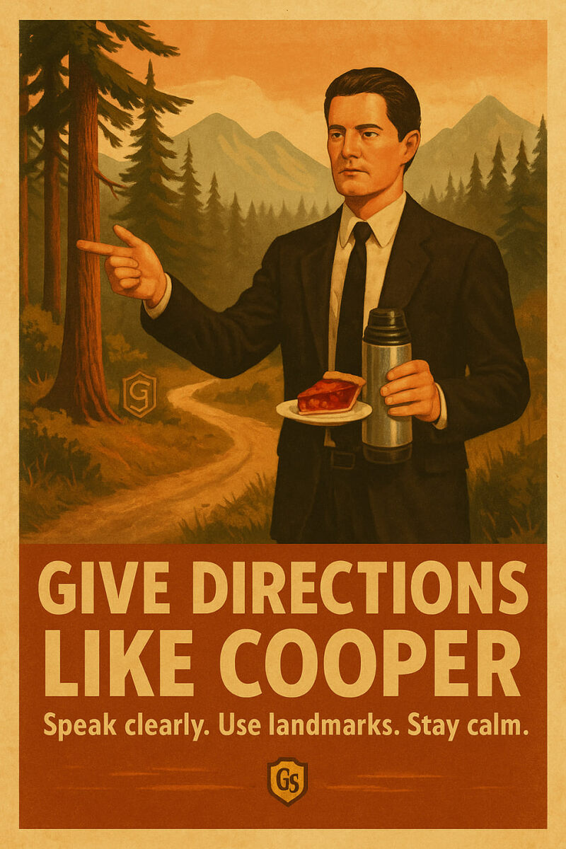 📄 “Navigation Protocol – Agent Cooper Method” 🧭 To: ESL Cadets of Field Communication & Small-Town Orientation 🔍 From: GS Department of Linguistic Tracking & Wilderness Description 📅 Date: 27.08.2025 🎙 Transmission Start: Special Agent Dale Cooper Reporting “Head north past the giant Douglas firs until you hear the owls. If you reach a log cabin with cherry pie cooling on the windowsill — you’ve gone too far.” Giving directions isn’t just about where to go. It’s how you say it — with clarity, calm, and a sprinkle of the surreal. In this operation, we channel the composure and linguistic sharpness of Agent Dale Cooper to guide English learners through the wilderness of direction-giving. 🎯 MISSION OBJECTIVE Train operatives to: 🔹 Give and follow directions clearly 🔹 Use nature-based vocabulary for rural, small-town, or outdoor settings 🔹 Remain calm, courteous, and Cooper-cool under communicative pressure 🌲 VOCABULARY DROP: NATURE & DIRECTION WORDS 💬 AGENT COOPER’S RULES OF D