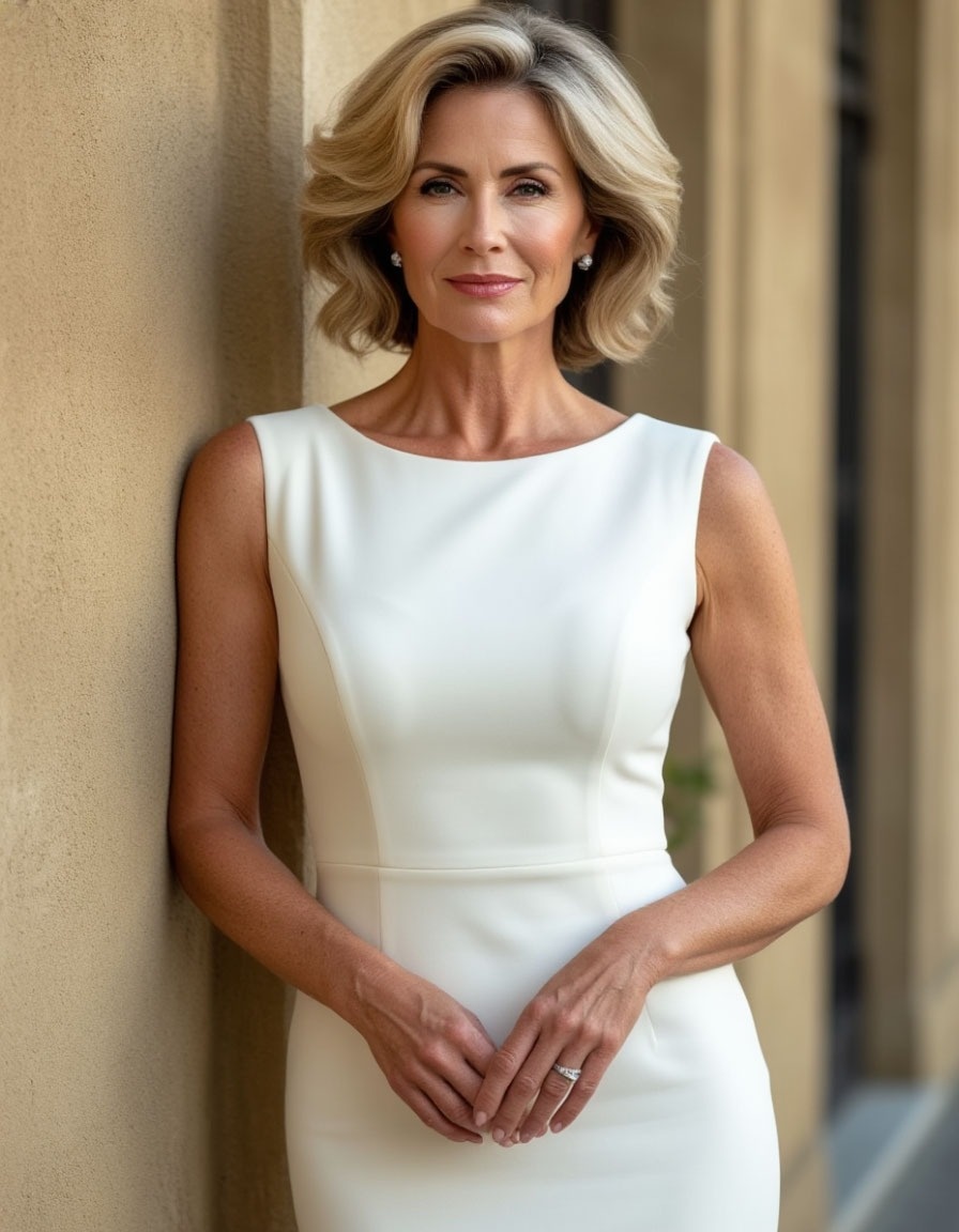Она стояла в углу, у двери, в белом платье до колен, плотно обтягивающем ее все еще по девичьи стройную фигуру. На шее — нитка черного жемчуга. Светлые волосы аккуратными волнами ниспадали на спину и были заколоты так, чтобы полностью открыть ее красивое лицо.