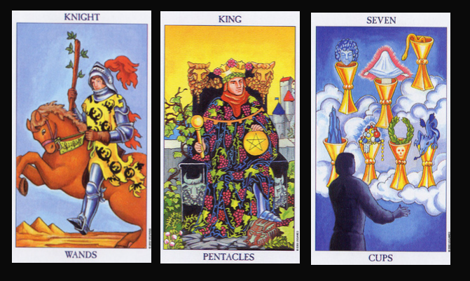 Замыкает триплет 7 кубков, и вот она может насторожить (я бы даже сказала, что она портит всю прекрасную картину). 7 - это момент анализа, взвешивания, выбора. Кубки это чувства и эмоции. Уже без толкования карт мы понимаем, что такие уверенные в себе Рыцарь и Король могут споткнуться о большое количество разных чувств, встретиться с выбором, когда захочется все, или все будет страшить.