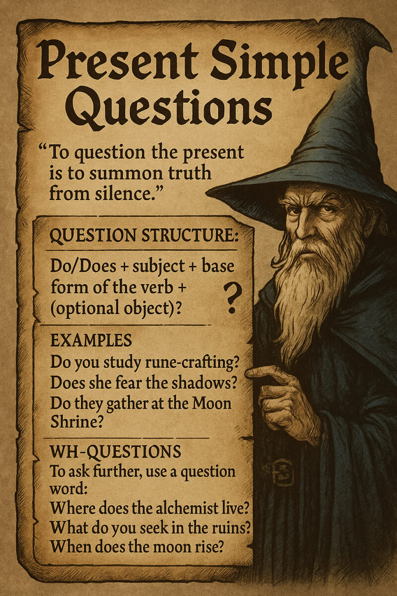 📜 PRESENT SIMPLE PROTOCOL — INTERROGATIVE INVOCATIONS OF THE NOW 🧙♂️ To: Apprentices of the Eternal Voice 🔮 From: Temporal Sage of the Third Circle 📅 Date: 21.08.2025 🎙 Arcane Transmission Begins “Those who ask, command. For to question the Now is to summon truth from silence.” To ask is not weakness. It is power. It is knowledge-seeking. It is the call that opens the gate. You stand at the door of truth. Your voice must knock. 🎯 OBJECTIVE Empower ESL spellcasters to: 🔹 Form Present Simple questions with clarity 🔹 Use do and does as spell initiators 🔹 Keep the main verb pure and unaltered 🔹 Conjure answers through structured inquiry 📚 SPELL STRUCTURE: QUESTION-FORMING RITUAL 🌀 Base Formula (General Inquiry Spell) → Do/Does + subject + base verb + (optional object)? ✨ Examples from the Grim Codex: 🧙♂️ Important: 🧪 YES/NO QUESTIONS – THE FIRST CIRCLE Simple, direct, and often magical. ⚔️ Answer with strength: 🧭 WH-QUESTIONS – THE SECOND CIRCLE Whispers to unlock deeper