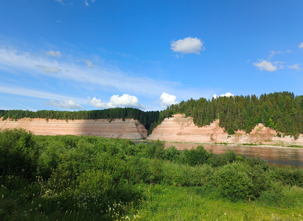 Здесь, в Опоках, крутые (до 70 гр.) обрывы берегов Сухоны достигают в высоту 60-80 м и напоминают слоёный пирог: чередующиеся полосы породы разных цветов – от чисто-белого через серо-голубые и зелёноватые до кирпично-красного. В обнажении породы перми – последнего геологического периода палеозойской эры - возраст больше 250 млн. лет. Здесь можно обнаружить древние окаменелости. Климат на Севере в эпоху поздней перми был самым жарким за всю историю Земли. Море постепенно отступало на юго-восток, и территорию современной Вологодской области покрывали населённые простейшими организмами мелководные постепенно высыхающие лагуны.