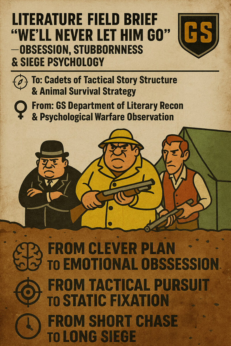📄 “We’ll Never Let Him Go” — Obsession, Stubbornness & Siege Psychology 🧭 To: Cadets of Tactical Story Structure & Animal Survival Strategy 🔍 From: GS Department of Literary Recon & Psychological Warfare Observation 📅 Date: 23.08.2025 🎯 Mission Objective: Assess Chapter 7 – We’ll Never Let Him Go to explore how the enemy's mindset shifts from reaction to obsession. Analyze how stubbornness creates a war of endurance and alters the power dynamics between predator and prey. 🦊 Intel Unpacked: The farmers — Boggis, Bunce, and Bean — make a bold decision: they will not leave until they catch Mr. Fox. They bring in tents, food, and guns. It’s no longer a hunt. It’s a siege. This is the turning point where human stubbornness becomes a character in itself. The farmers aren't strategizing anymore — they’re consumed. And that makes them dangerous… and stupid. Meanwhile, the Foxes remain underground, listening, waiting. The deeper the farmers dig into obsession, the more the Fox family prep