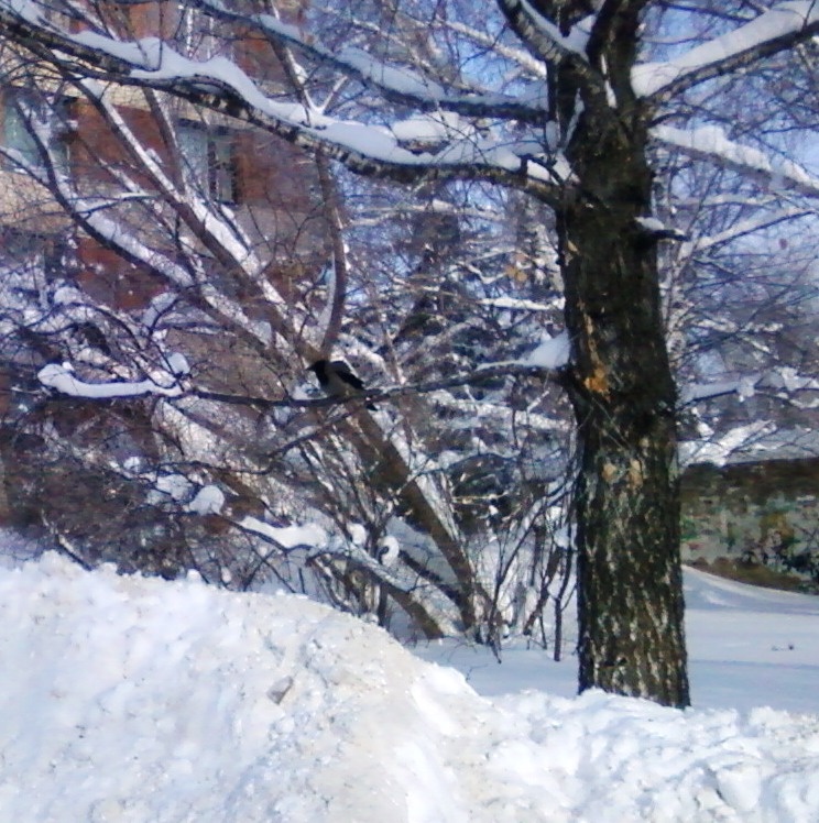 Вороне где-то бог ....... Проходя по улице, я увидела ворону, которая сидела на ветке берёзы и сосредоточенно смотрела куда-то так пристально , что я остановилась, заинтересовавшись что будет дальше. И тут, из-за снежного бугра, появляется собака увидев ворону, присела под деревом . Ну как тут не вспомнить басню Крылова. - "Вороне где-то бог послал кусочек сыру; На ель Ворона взгромоздясь,да призадумалась"... и так далее. - ..."На ту беду Лиса близёхонько бежала ..." - ..."Спой, светик, не стыдись!"... - ..."Ворона каркнула во всё воронье горло; Сыр выпал - с ним была плутовка такова." Вот такие интересные истории, мы можем частенько наблюдать. Только нужно немножечко отвлечься от своих проблем и взглянуть на мир вокруг нас, другими глазами, можно увидеть очень много интересного. Если у кого-то есть подобные наблюдения - поделитесь, будет очень интересно.