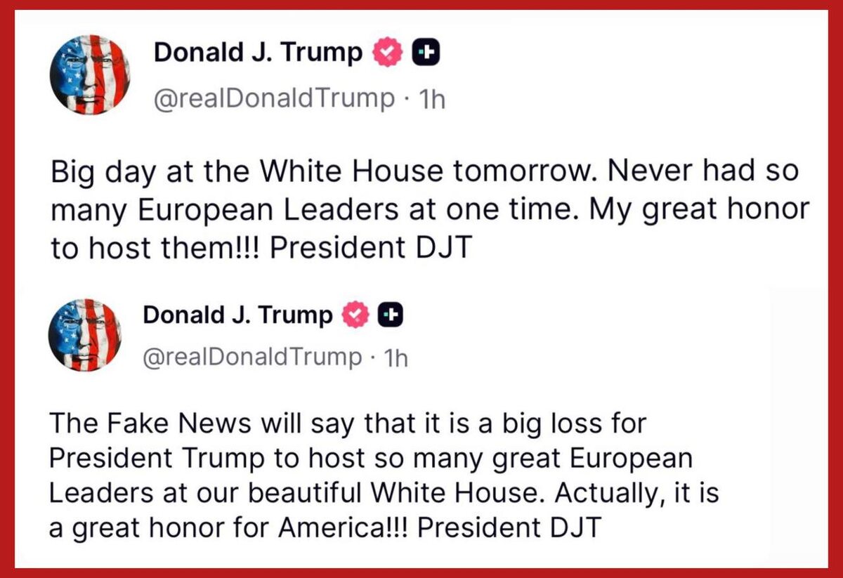 🔴Трамп - о составе сегодняшней делегации: В Белом доме — большой день. Никогда прежде здесь не собиралось столько европейских лидеров одновременно. Для меня — огромная честь принимать их! Фейковые СМИ будут твердить, будто для президента Трампа — это большое поражение, принимать столь уважаемых европейских лидеров в нашем прекрасном Белом доме. На самом деле это — великая честь для Америки! Президент Дональд Трамп Сегодня в 20:15 по московскому времени Трамп проведет двусторонние переговоры с Зеленским. В 22:00 по мск начнется встреча с участием Урсулы фон дер Ляйен, Фридриха Мерца, Джорджи Мелони, Александера Стубба, Эммануэля Макрона, Марка Рютте, Кира Стармера. Подпишись на Телеграм Александр Семченко