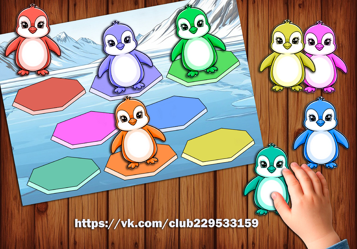 В далёкой стране, где небо голубое, а снег искрится на солнце, живут весёлые пингвины! Каждый из них имеет свой особенный цвет: один как яркое солнце – жёлтый, другой как сладкая малина – розовый, третий как чарующее море – голубой.. <ссылка на ШАБЛОН в конце статьи> Однажды пингвины решили устроить весёлую игру на своём любимом водоёме. Но вот незадача – всё вокруг стало очень скользким, и вдруг один пингвин потерял равновесие и чуть не упал в ледяную воду! Чтобы этого не случилось, дорогие друзья, нашим пингвинам нужно быстро вернуться на свои льдины, ведь только там они в безопасности. А теперь ваша задача: помогите каждому пингвину найти свою льдину! Помните, что зеленый пингвин может стоять только на зеленый льдине, розовый пингвин – на розовой, голубой – на голубой, а красный – на красной. Постарайтесь как можно быстрее расположить пингвинов на их льдинах, чтобы они могли наслаждаться весёлой игрой и не упасть в ледяную воду! ✅Развивающая игра "Цветные Пингвины и их льдины". Я ис