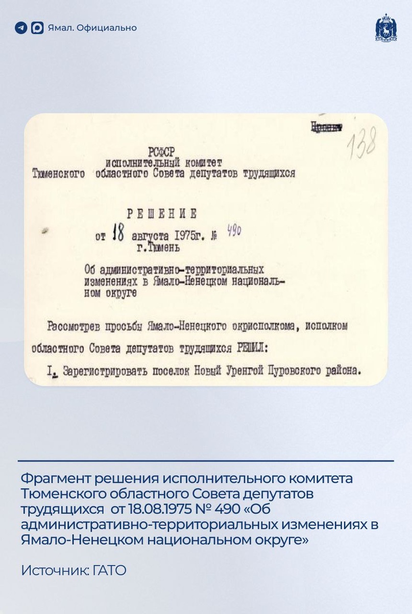 Новому Уренгою – 🎂 Ровно 50 лет назад, 18 августа 1975 года, был официально зарегистрирован посёлок Новый Уренгой. Документ с решением исполкома Тюменского областного совета депутатов трудящихся хранится в Госархиве области. Десятью днями ранее окружные власти просили исполком рассмотреть вопрос о регистрации нового населённого пункта. Аргументы были весомыми: на тот момент в поселении размещалось 16 производственных подразделений и проживало 750 человек, из которых 700 – работали. Название выбрали в честь освоения Уренгойского нефтегазоконденсатного месторождения, и чтобы не путать с уже существующим посёлком Уренгой. 🎉 С юбилеем, Новый Уренгой! Город, который из небольшого посёлка за пять десятилетий вырос до газовой столицы страны. 🗓 Праздник по традиции жители и гости отметят в первое воскресенье сентября. #Юбилей_для_людей 🐻❄️ ЯМАЛ. Официально | Подписаться